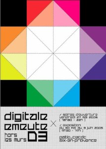 VISUEL DE L’EXPOSITION "DIGITALEEMEUTE HORS LES MURS" Publié le juin 20, 2008Mai 1, 2014 par liseco Réalisation du visuel et de la programmation artistique. Le visuel pouvait se transformer origami. ©Lise Couzinier (2005) En savoir plus sur l’exposition Partager : Cliquer pour partager sur X(ouvre dans une nouvelle fenêtre) X Cliquez pour partager sur Facebook(ouvre dans une nouvelle fenêtre) Facebook J’aime chargement…