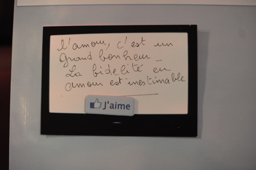 À rebours du “tout tout de suite”, et en en détournant les outils, l’amour-œuvre d’Ela & Dimitri ne se consomme pas d’un trait comme on vide un verre pour se perdre, il se remplit d’œuvres au goutte-à-goutte pour se retrouver “ensemble”. Dans leur dia- logue, l’instantanéité ne sert à rien d’autre qu’à délayer, repousser encore le moment supposé magique de la rencontre, censée précéder la “consommation” de l’acte amoureux, baiser ou baise… et c’est précisément cette double prise de recul, cette double mise à distance, qui vient laisser le temps, l’énergie, le loisir de construire les œuvres, les sentiments, et la relation dans sa ri- chesse de formes, de temporalités, d’échos…