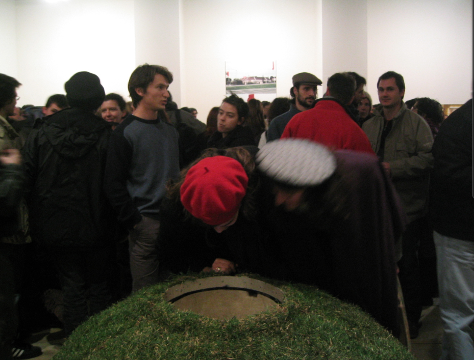 Au sommet d’un monticule végétal, celui qui veut voir doit verser son obole aquatique. Ainsi grâce à l’eau, des images troublantes apparaissent, suggérant l’utopie d’une vie subaquatique, la fusion du corps humain et du végétal, du solide au liquide… Visions s’insinuant à la frontière des règnes et des éléments, où l’homme se rêve comme un prolongement organique de la Nature même. L’eau comme tout symbole correspond à deux plans opposés, l’eau est source de vie comme de mort, créatrice et destructrice.Ces images sont issues de la bande vidéo.