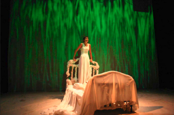 Une intimité à couper le souffle dans un grand décor blanc, fait de drapés interminables dont on ne sait où ils commencent et où ils finissent. Décor dans lequel la comédienne se débat seule avec ce texte tragique. Une mère raconte la maladie fulgurante et la mort de sa petite fille alors âgée de 8 ans, sous un long drap qui dessine sa bouche, son visage blanc sans yeux, sa silhouette longiligne, tel un fantôme érigé comme une sculpture sur son socle, un lit « momie », pansé comme un être pour affronter la mort et garder un souvenir intact des moments de tendresse.La nature omniprésente dans le film projeté en fond de scène prend le dessus sur ce décor laiteux et le colore. Un coloriage débordant où le personnage se confond et disparaît sous la mer. Des herbes folles grandissent en accéléré, surviennent tels des virus agités… Envahi, le corps se défend survivre, la nature ne cesse de le surprendre, une course effrénée… Et les chemins complexes de la nature rejoignent ceux où véhicule notre sang, on perçoit ainsi la fusion. Des herbes se meurent et des êtres poussent….