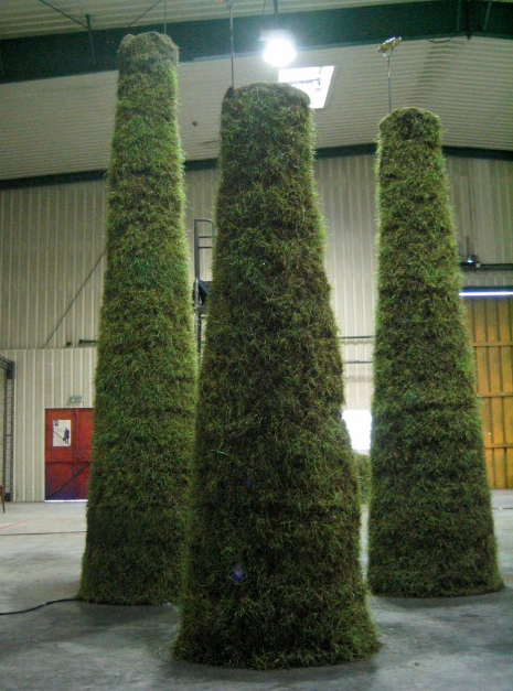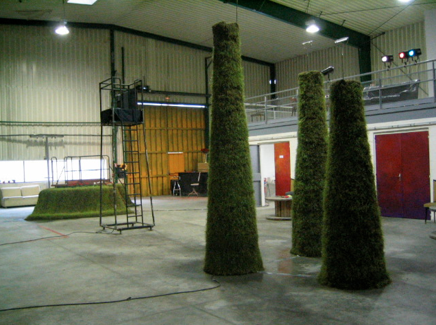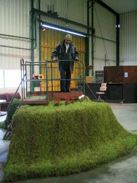 These enigmatic works, referring to the world of Franz Kafka appear to us powerful and out of nowhere. Strange sensations sparking disturbing echoes and reflections. The work is lived physically, now one must look up to see the top of these long vegetable tubes, carnivorous mouths, or now one must cross a bridge and observe gradually the emergence of human flowers while still keeping the distance and being observed by « Mr. Big Brother » on top of a watchtower. Eye whose movements are clocked by the frenetic sweep of a car wiper. Virtually a laboratory environment where water and vegetation took over, facing the men battling against their own technology.