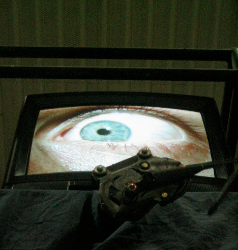 Ces oeuvres énigmatiques, en référence à l’univers de Franz Kafka nous apparaissent puissantes et sorties de nulle part. Sensations étranges suscitant des échos et des reflets inquiétants. L’œuvre se vit physiquement, il faut tantôt lever la tête pour apercevoir du haut de ces longs tubes végétaux, des bouches carnivores, ou tantôt traverser une passerelle et assister à l’éclosion de fleurs humaines peu à peu tout en gardant toujours la distance et en étant observé par « Mr big brother », en haut d’un mirador. Œil dont les mouvements sont rythmés par le balayage frénétique d’un essuie glace de voiture. Une ambiance presque laboratoire où l’eau et le végétal ont pris le dessus, face aux hommes luttant contre leur propre technologie.