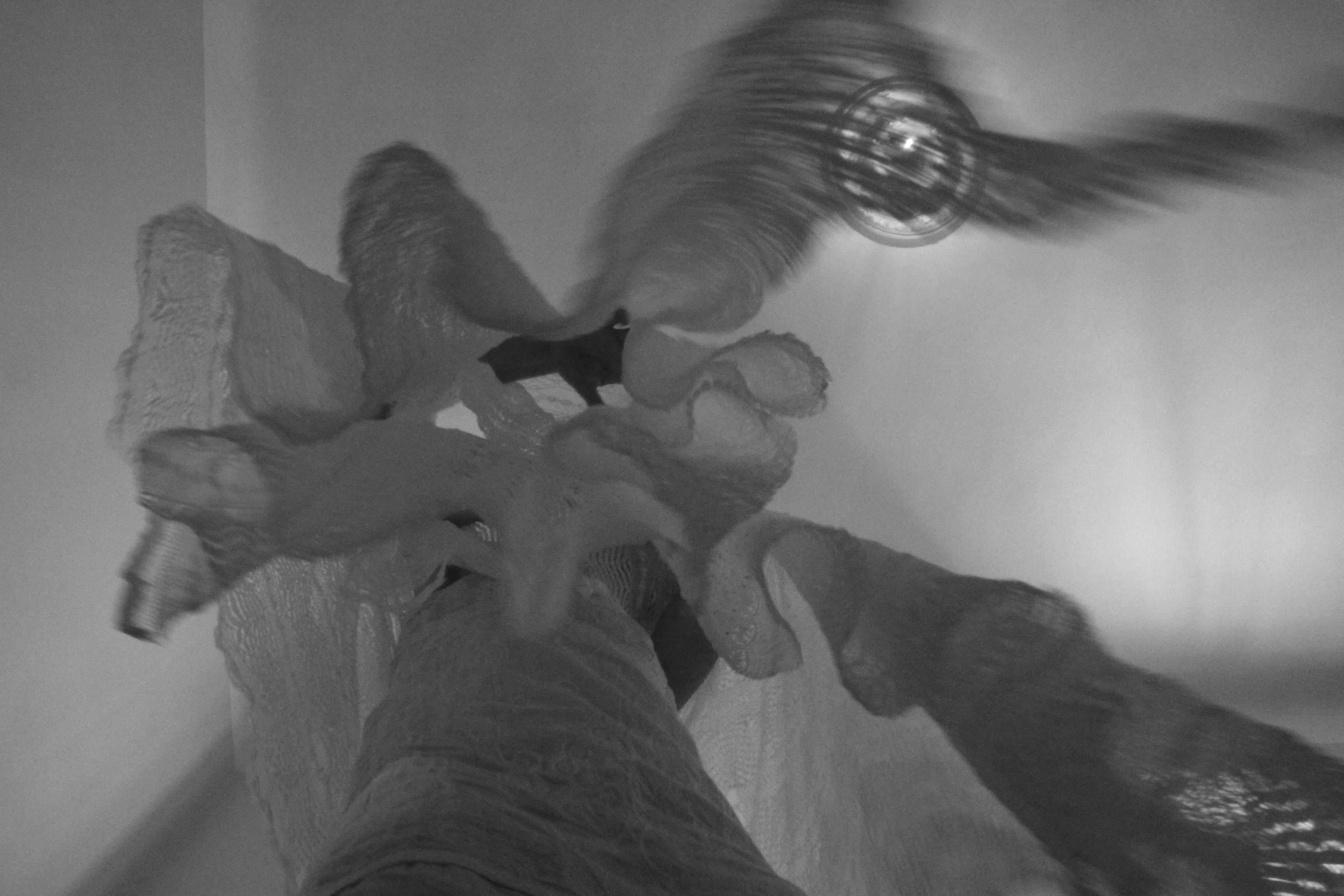 Trace de chair tantôt sur un mur, trace d’un envol où la matière devient plus légère pour l’autre. Ici deux images sont suspendues comme sur un fil. Une situation particulièrement périlleuse ? que celle d’éviter une rencontre physique. Chacun s’immerge à la recherche de l’autre dans une possible matérialisation de l’esprit du lieu où il se trouve. Que voient-ils, Ela & Dimitri, chacun allongé seul à seule à re- garder des fantasmagories descendre du plafond ? “une épée de Damoclès au-dessus de la tête” ? l’inévitable possibilité d’un échec amoureux ? une avalanche d’anges-lumière en provenance du 7e ciel ? —