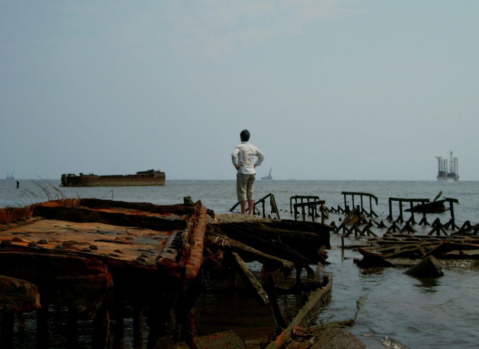 Cette sentence est ici illustrée par la présence de cet homme au bord de l’eau clivé entre le passé fait d’une terre de sable et un futur toujours plus complexe tout de béton et de métal. Au loin sur l’eau, on peut apercevoir son seul lien, son seul référent à la tradition et au passé : un pêcheur qui avec son filet perpétue les coutumes ancestrales dans un geste millénaire. Il regarde les épaves au loin sur la mer, navires échoués et abandonnés. Coques de noix à la dérive. Jouets de l’homme moderne construisant frénétiquement pour mieux dominer, tel un apprenti sorcier, sans se soucier de l’impact laissé et de la trace de ses actions.