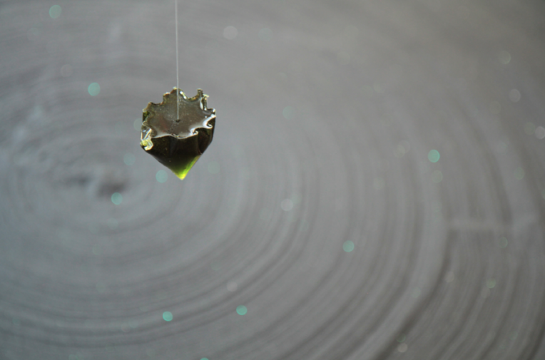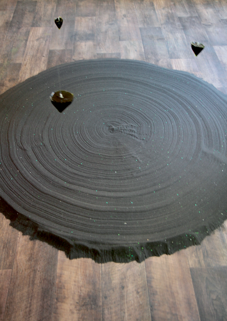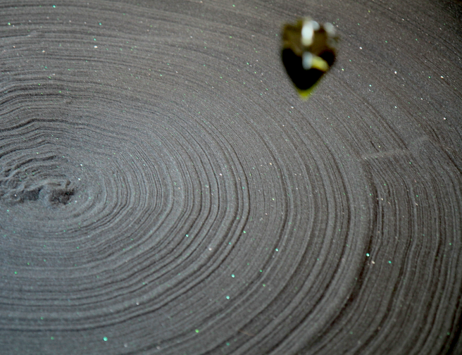 On assiste au mouvement naturel de trois pendules ; des liquides transparents solidifiés illustrant un moment suspendu cosmique. Equilibre, magnétisme, circulation se mêlent. Union du minéral (sable), végétal (résine végétale, algues) et de l’homme. Chaque déplacement, chaque son, chaque soffle est comme capté par les petites sculptures et rend compte de l’énergie invible des éléments entre eux. Les sillons rappellent ici, les disques vyniles gravés d’ondes sonores.