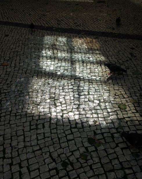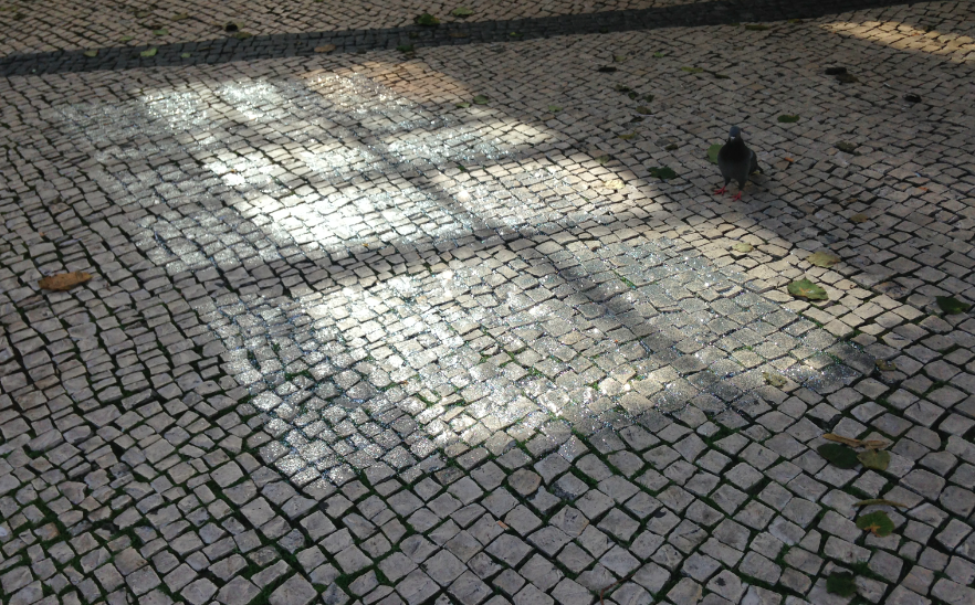 Paillettes argentées sur pavés. ( Lantejoulas sobre pedra da calçada ).