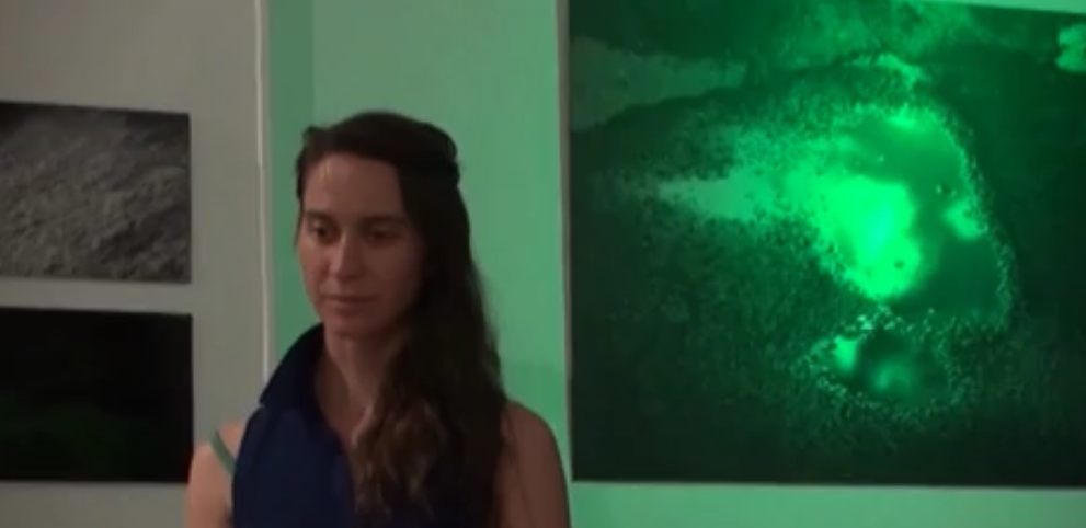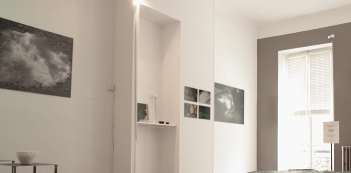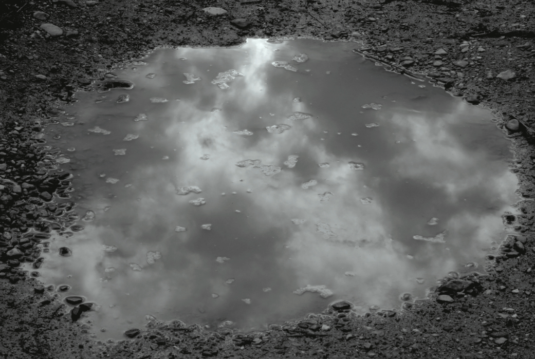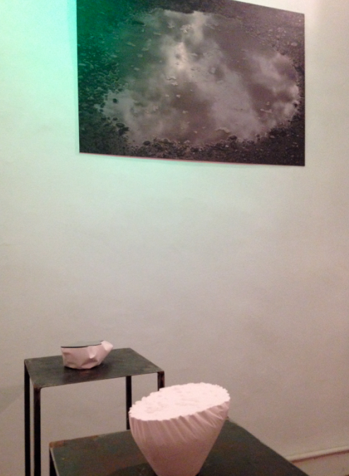 Photographies impressions directes sur plaque d’aluminuim 105 x 80 cm. Aniane, L’Hérault (2014)J’utilise un procédé d’impression à UV en quadri color, qui n’imprime pas le blanc. Ainsi, les vides ou manques, laissent apparaître la surface, le support lui-même (l’aluminum). Ces zones, reflètent la lumière extérieure qui change suivant nos déplacements. Ces photographies sont parfois éclairées à l’aide d’une lumière verte, celle-ci envahit peu à peu le support, contamine l’image et en change sa lecture. La couleur verte est à la fois liée à la couleur des végétaux et par extension tout ce qui est frais, jeune, vigoureux et à consommer. Elle évoque aussi la pollution (en exemple, les algues qui prolifèrent et étouffent les fonds marins), leur apparence « chlorophylle naturelle » est trompeuse. Être charmé par l’idée que l’on se fait de la nature, l’eau du ciel mélangée à la terre n’est peut-êre en réalité que du poison. Se reflètent alors, dans ces flaques ténébreuses, les masques humains transformés en fantômes ou démons… Le titre « le chant des surfaces » renvoie de façon symbolique au chant des sirènes, une séduction mortelle et un avertissement ici, sourd et intérieur, face à nos propres tentations à détruire. La sirène est considérée comme l’âme du mort, qui a manqué sa destinée et qui s’est transformée en vampire dévorant. L’homme ne se dévore-t-il pas lui même (autodestruction)?
