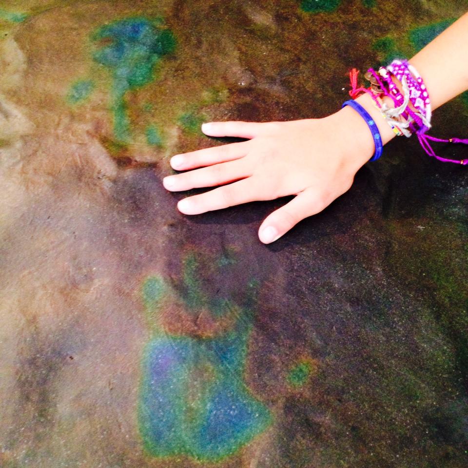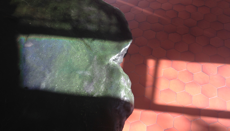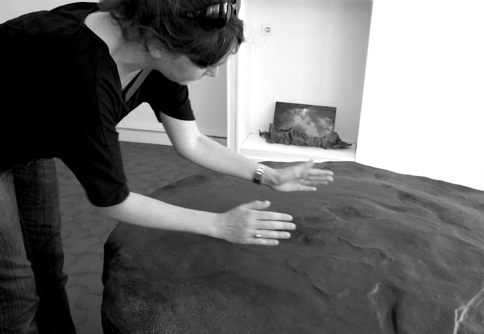 Liquide solidifié à l’image des roches plutoniques, dressée comme un dolmen, elle témoigne d’une mémoire, d’un temps qui s’écoule et qui se fige. Mais sous son apparence robuste et lourde, sa “peau” est friable et sensitive. Elle réagit à la chaleur et change de couleur. Notre main réchauffe sa surface mais pas son coeur.