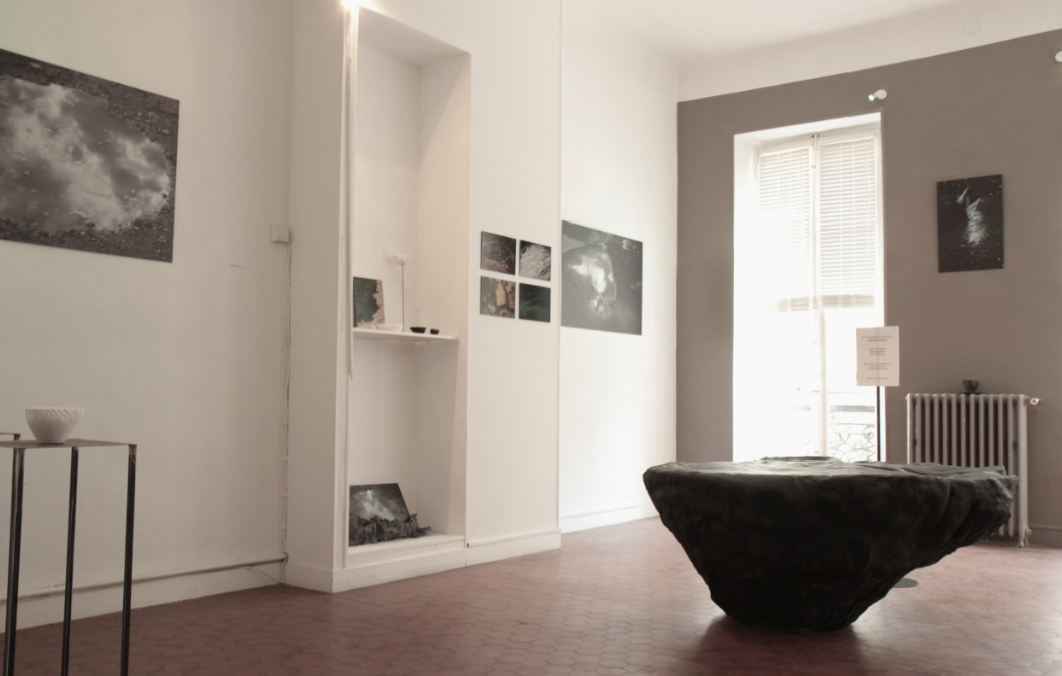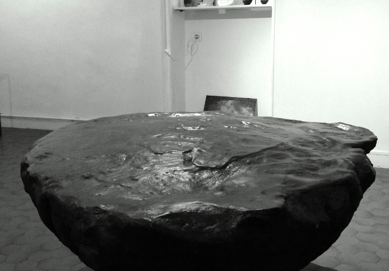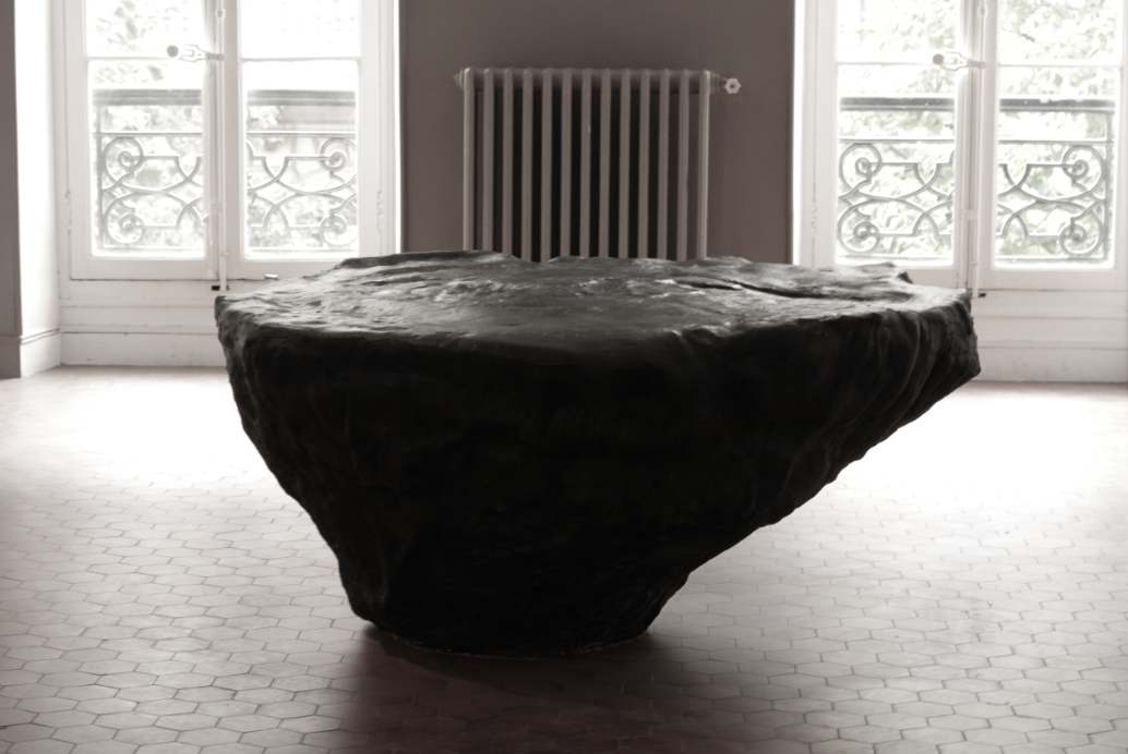 Rocher, pierre de lave ou champignon, posé au centre de la pièce, la sculpture semble être apparue comme par enchantement. Ejectée d’une surface, résidu ou création, par son pouvoir magnétique, elle nous séduit et nous attire comme un aimant.